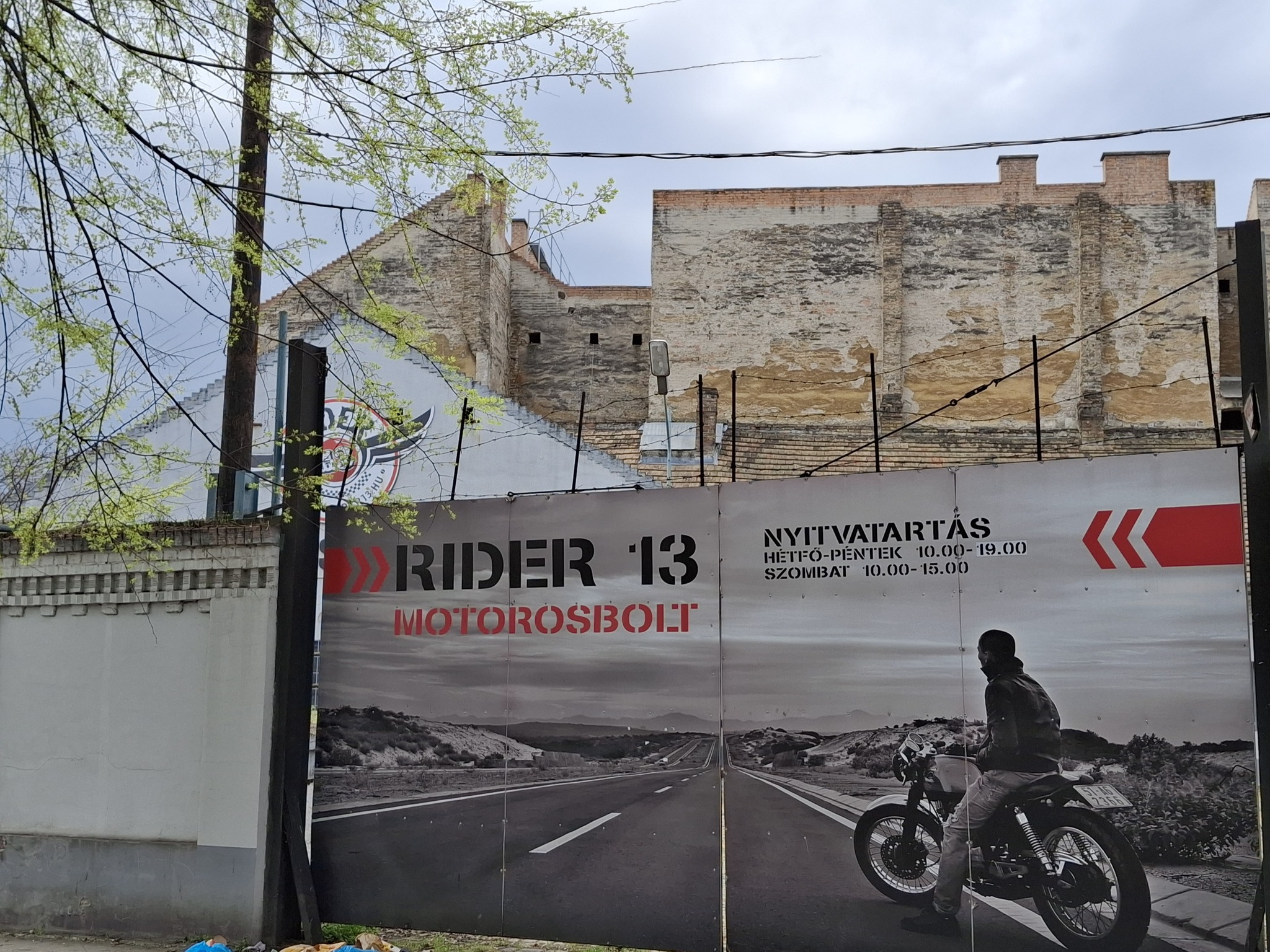 Ez a kép erős városi átmenetérzetet közvetít: egyszerre szól a múltról, a pusztulásról és a jelen harsány reklámnyelvéről. A háttérben álló, vakolatát vesztett tűzfalak nyers, sebzett felülete nagyon szépen ellenpontozza az előtérben kifeszített, steril motoros molinót. A fotó egyik legérdekesebb feszültsége éppen ebből fakad: a reklám a szabadságot, az utat, a dinamizmust ígéri, miközben mögötte egy lepusztult, üres városi sebhely látszik.